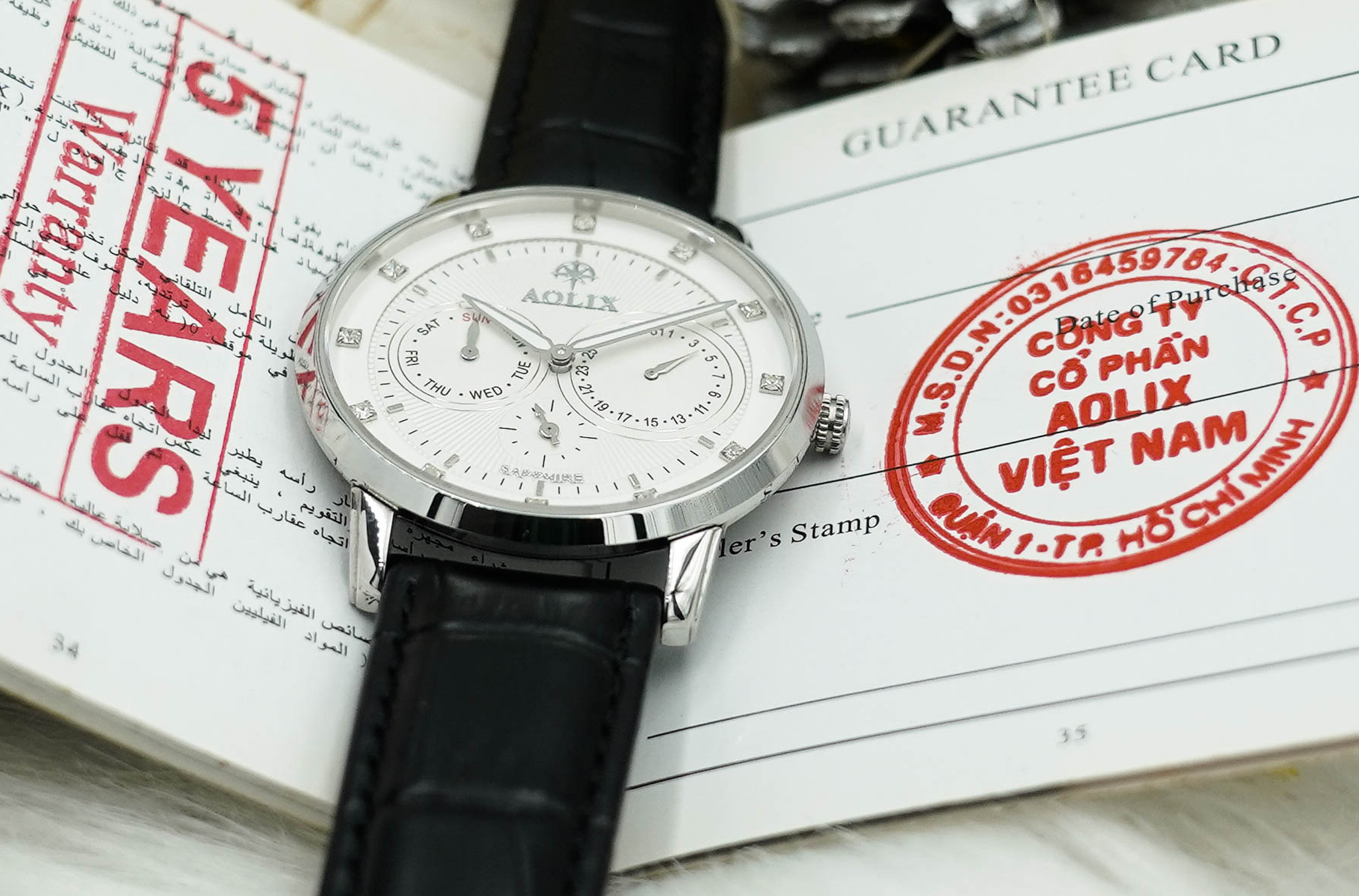 - Mỗi chiếc đồng hồ Aolix đều có thẻ bảo hành chính hãng với logo Aolix và in tên người mua hàng trên thẻ, ngày mua hàng, mã sản phẩm. Có mã QR Code dùng để quyét bằng zalo (đối với hệ điều hành Androi) và dùng camera quyét (hệ điều hành IOS - Iphone) Mã code sẽ đưa bạn đến đúng mã sản phẩm mà bạn đã mua, trang web chính hãng Aolix: https://aolix.vn/dong-ho-nam-day-da-aolix-al-7081m-sapphire-chinh-hang