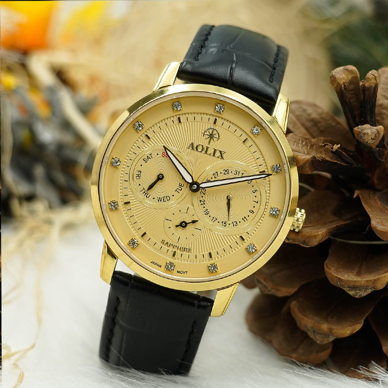 Chiếc đồng hồ nam dây da Aolix AL-7081M sapphire khoác lên mình vẻ ngoài năng động, trẻ trung đầy sự sang trọng. Mặt đồng hồ màu vàng nổi bật thu hút ánh nhìn cùng hàng số đính kim cương lấp lánh hoàn mĩ. Sở hữu thiết kế 5 kim với nhiều tính năng nổi bật. Dây da mang lại cảm giác thoải mái, dễ chịu khi đeo.Mặt kính sapphire chống trầy cùng độ chống chịu nước tốt lên đến 3ATM